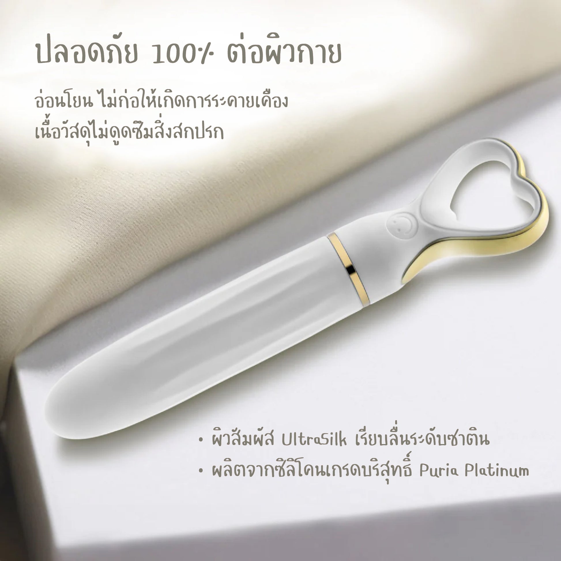 วัสดุทำจากซิลิโคน Puria® platinum-cured เกรดปลอดภัยต่อร่างกาย ผิวสัมผัส UltraSilk® ให้ความรู้สึกนุ่มลื่นและสบายเมื่อสัมผัส ด้ามจับรูปหัวใจเพิ่มดีไซน์ที่ดูเก๋และจับถนัดมือ พร้อมขอบสีทองเล็ก ๆ เพิ่มความน่ารักแบบมีสไตล์